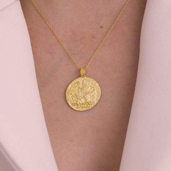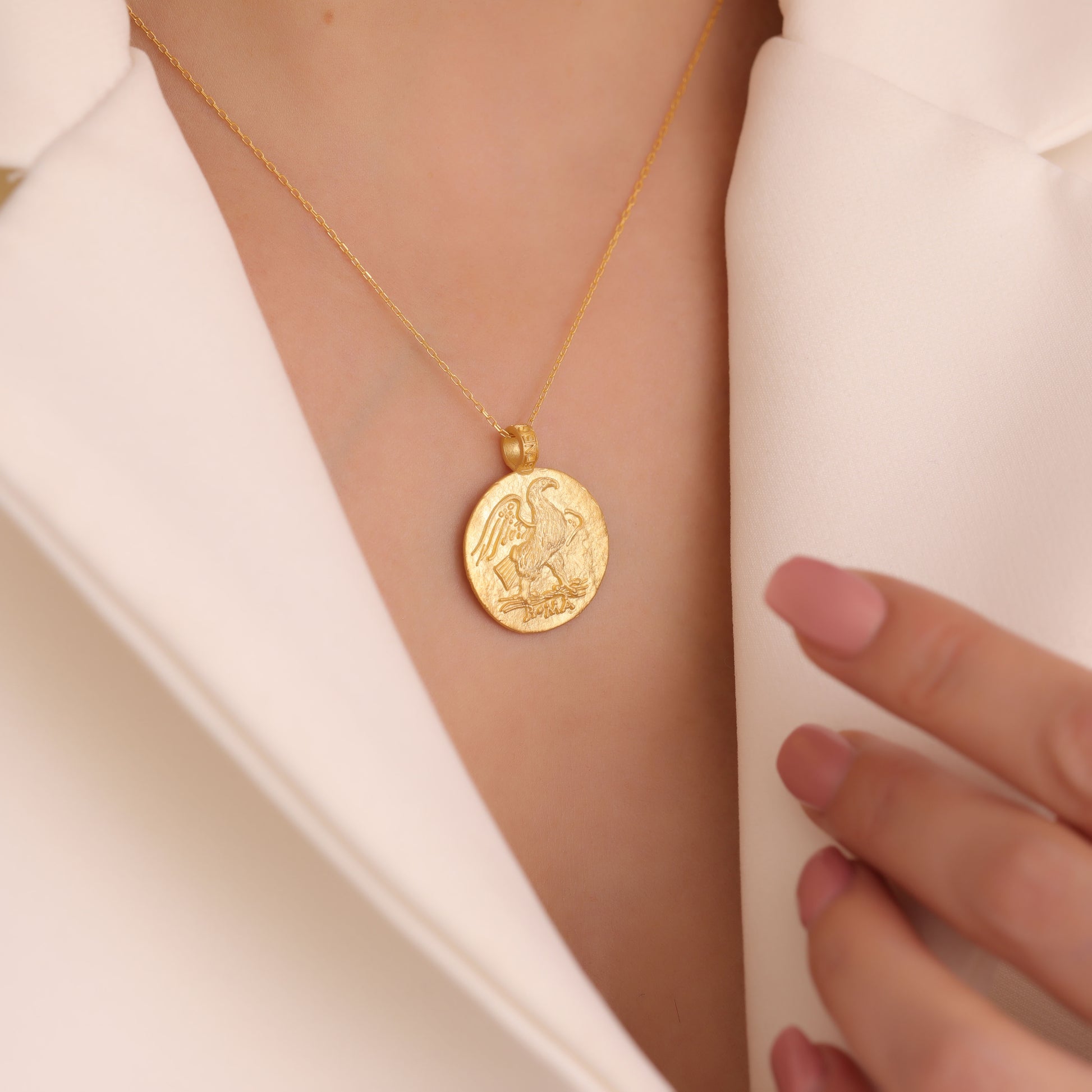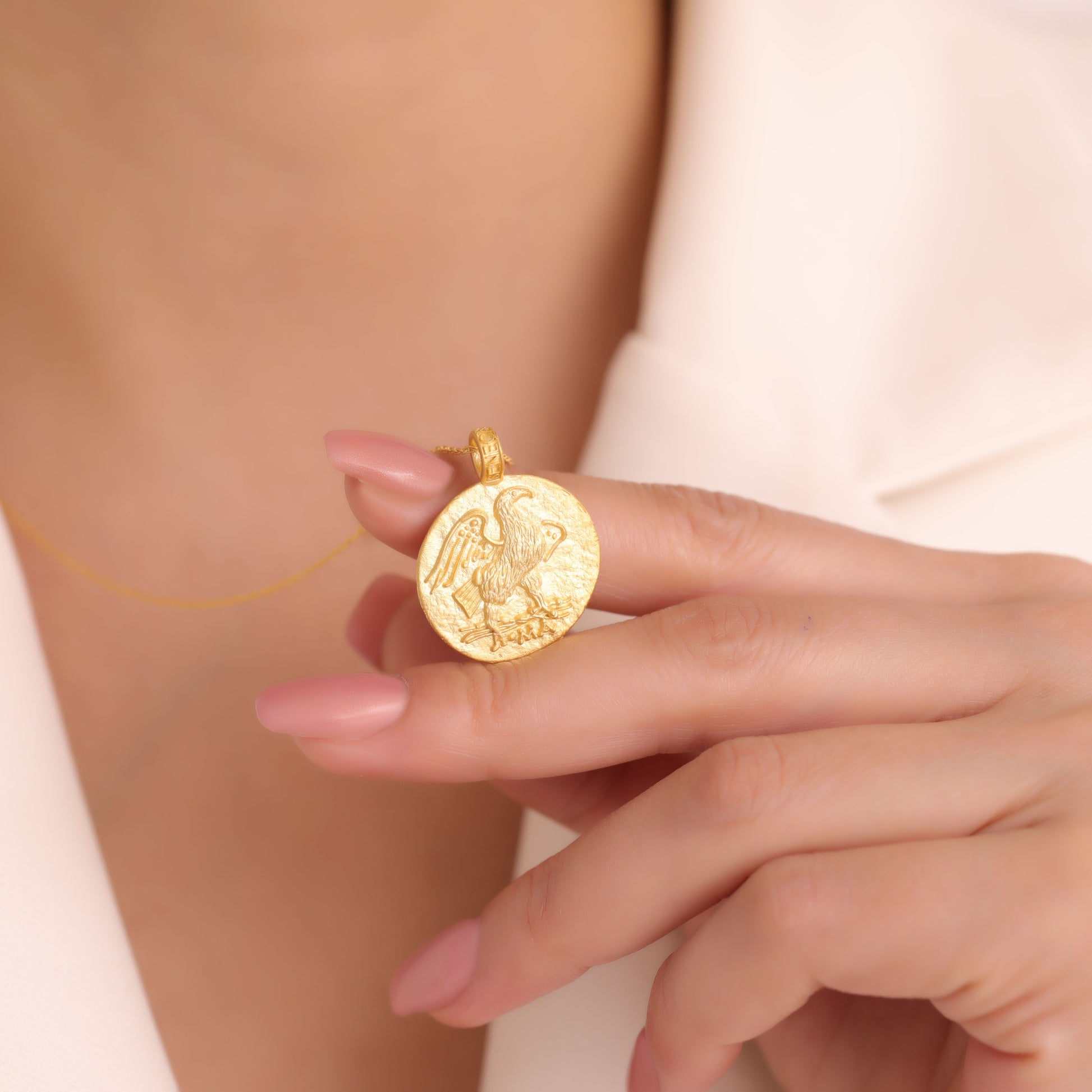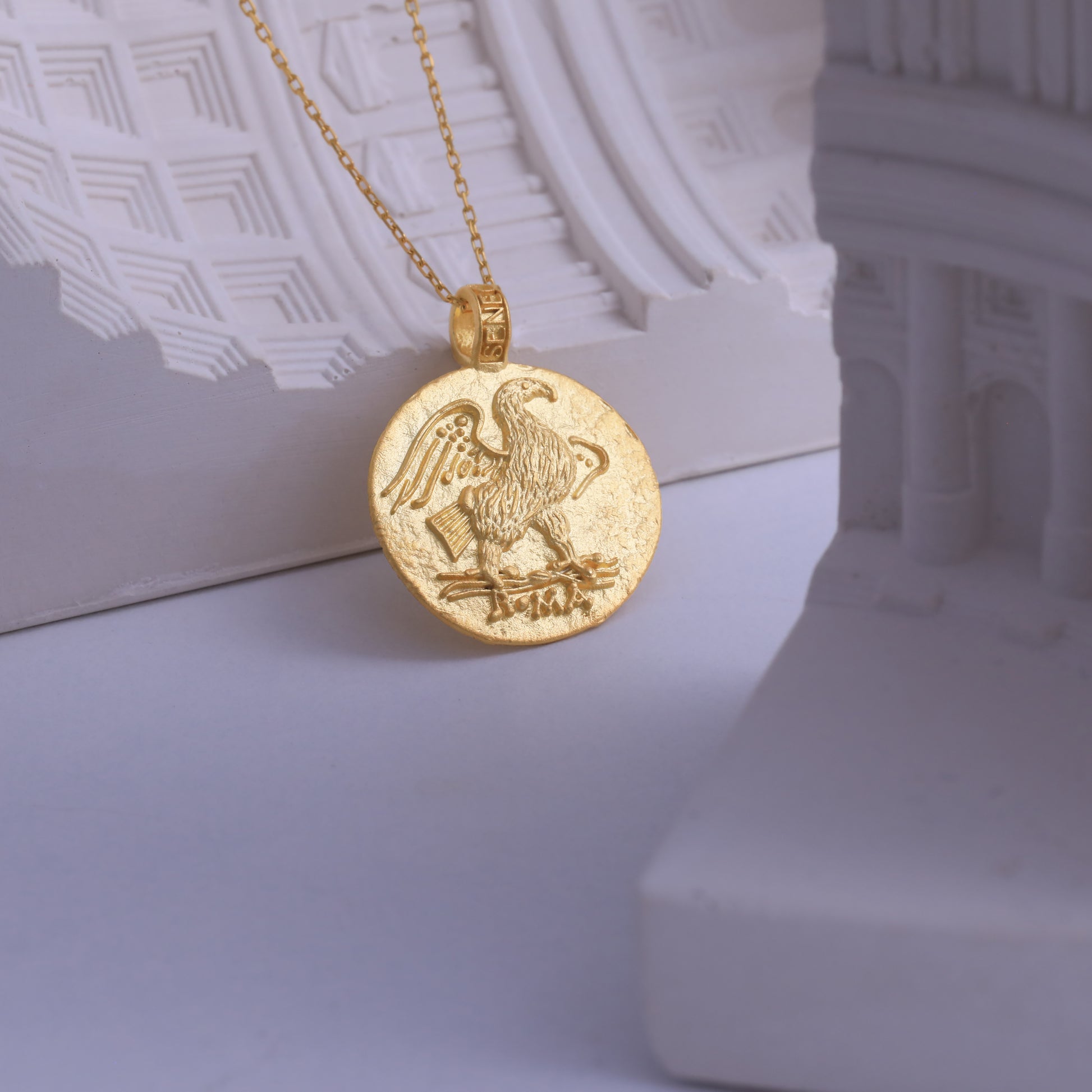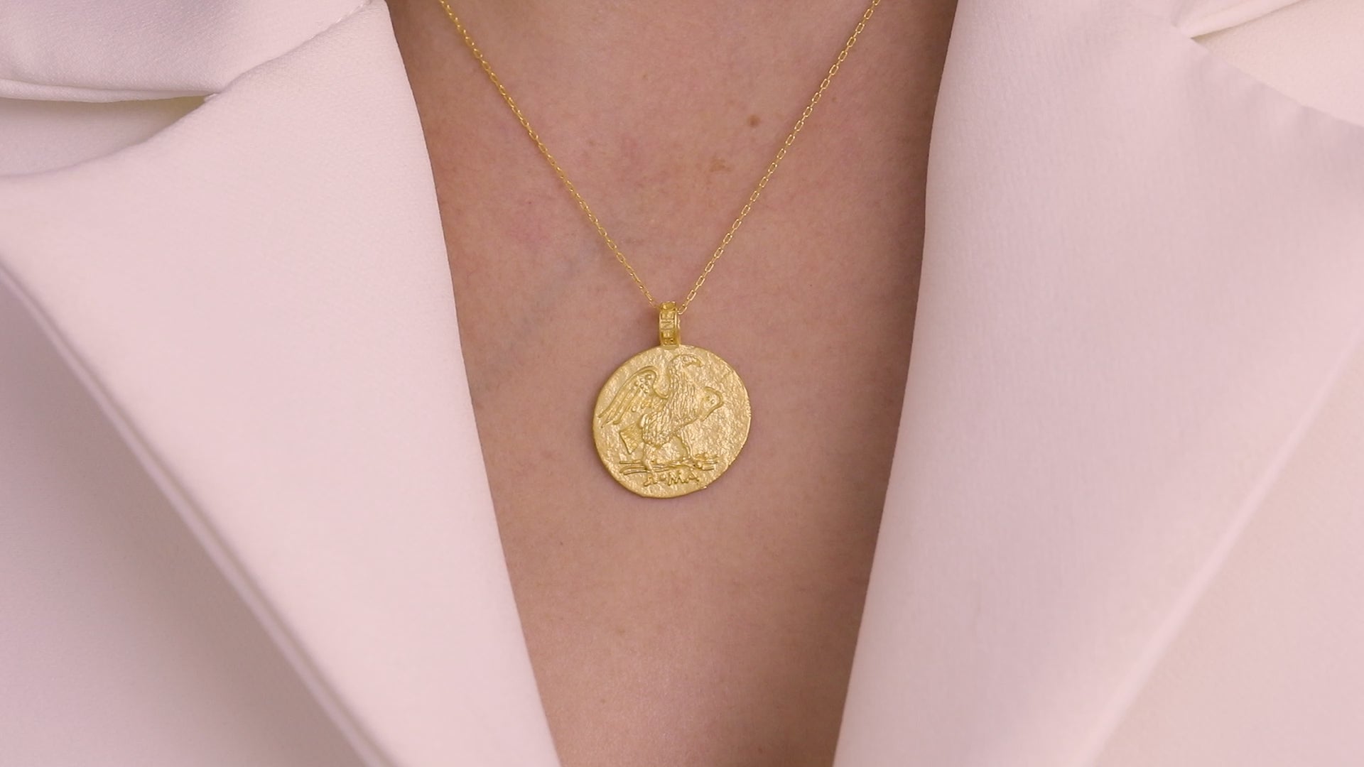 This unique necklace combines the elegance of ancient Rome with modern design. Inspired by an authentic Roman coin on display in an Italian museum, the design brings the splendor of the past to the present.