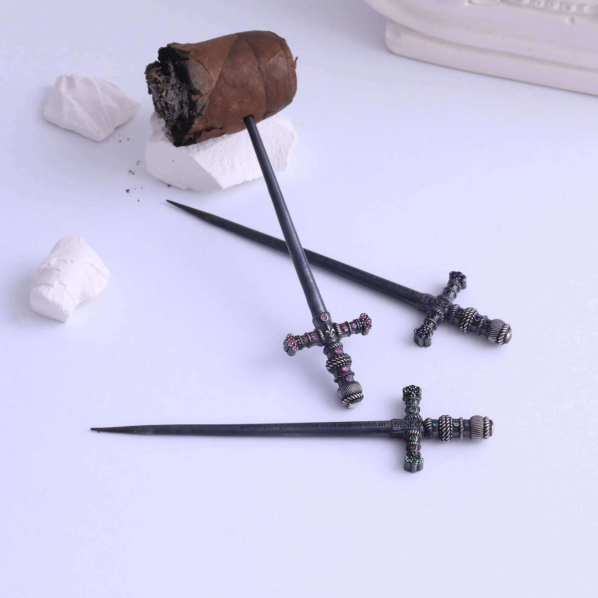 This unique cigar pin from the Eterna Collection combines the grandeur of the Eastern Roman Empire with the symbol of the oath sword. Its strikingly artistic details are crowned with over thirty zircon stones, enhancing its elegance.