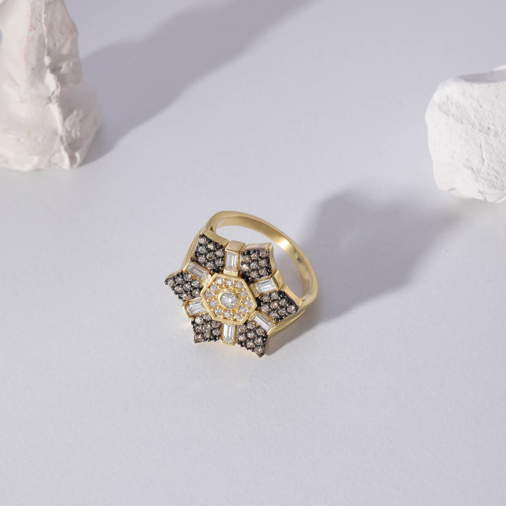 Discover this unique design, which brings the night's brightest star and the timeless elegance of Art Deco to your finger. Brought to life by Seneca Jewelry's artistic vision, this ring offers a captivating dance of light and shadow, modern lines, and vintage influences. A work of art in every detail, this piece was designed to be the ultimate complement for the stylish woman.