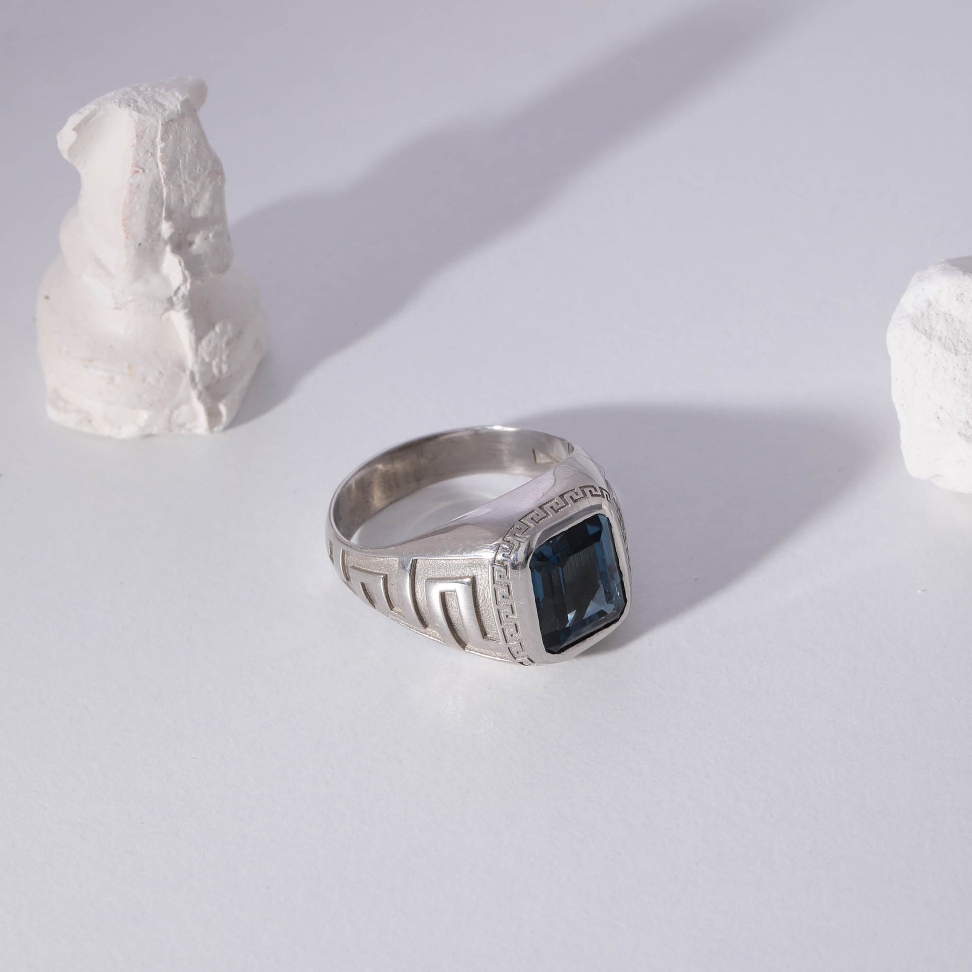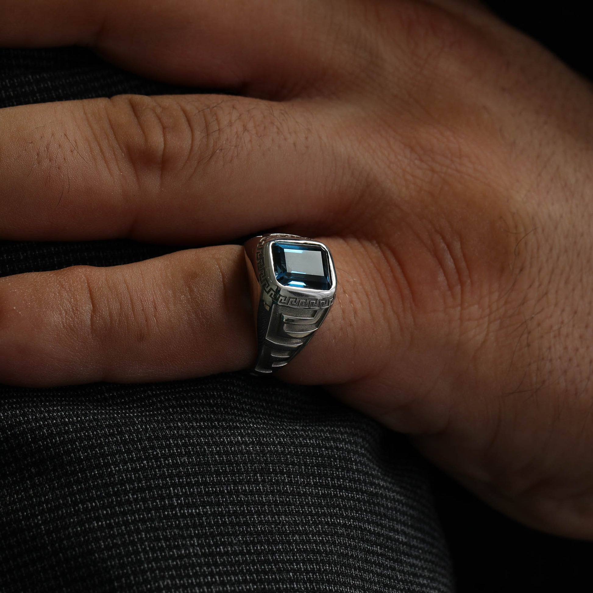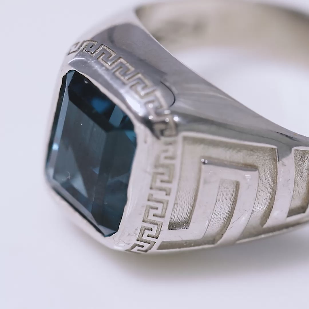 Discover this unique design, a symbol of strategy, wisdom, and eternity. Designed and crafted by the master craftsmen of Seneca Jewelry, this ring combines modern manly style with the powerful symbolism of the ancient world. The London Blue Topaz , in the deepest shades of the ocean, at its center exudes charisma and mystery, while the Meander (Greek Key) pattern encircling the side arms of the ring represents the eternal cycle of life and continuity.