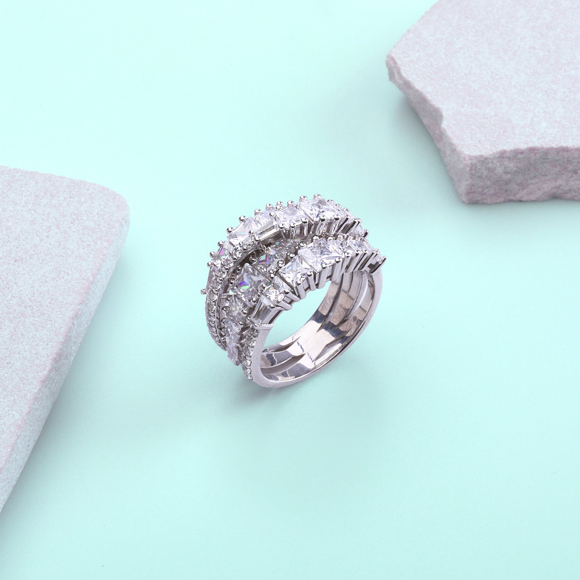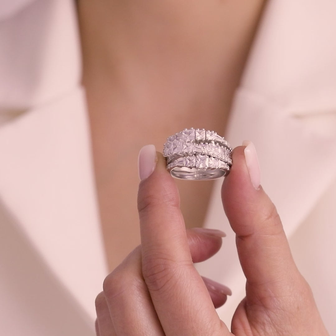This special ring, dazzling with its sleek and sophisticated design, reflects the bold style of the Grandezza Collection. Crafted from 925 sterling silver and plated with white gold, this piece offers a rich sparkle with the harmony of high-quality zircon stones in various cuts. Representing elegance and power in every look, this ring is designed for women who want to add glamour to their style.