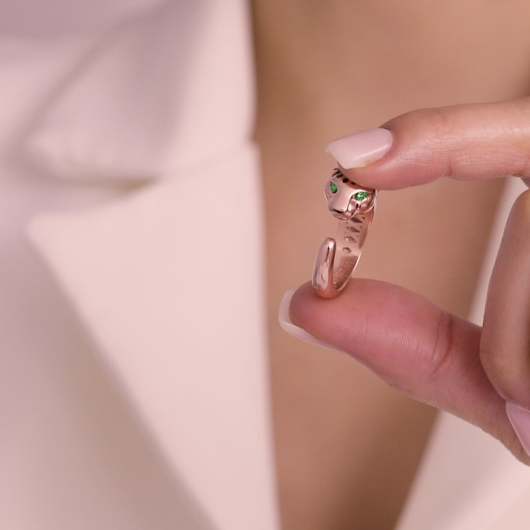 This unique panther ring, a symbol of power and elegance, is crafted from 925 sterling silver with Rose Gold Plated.