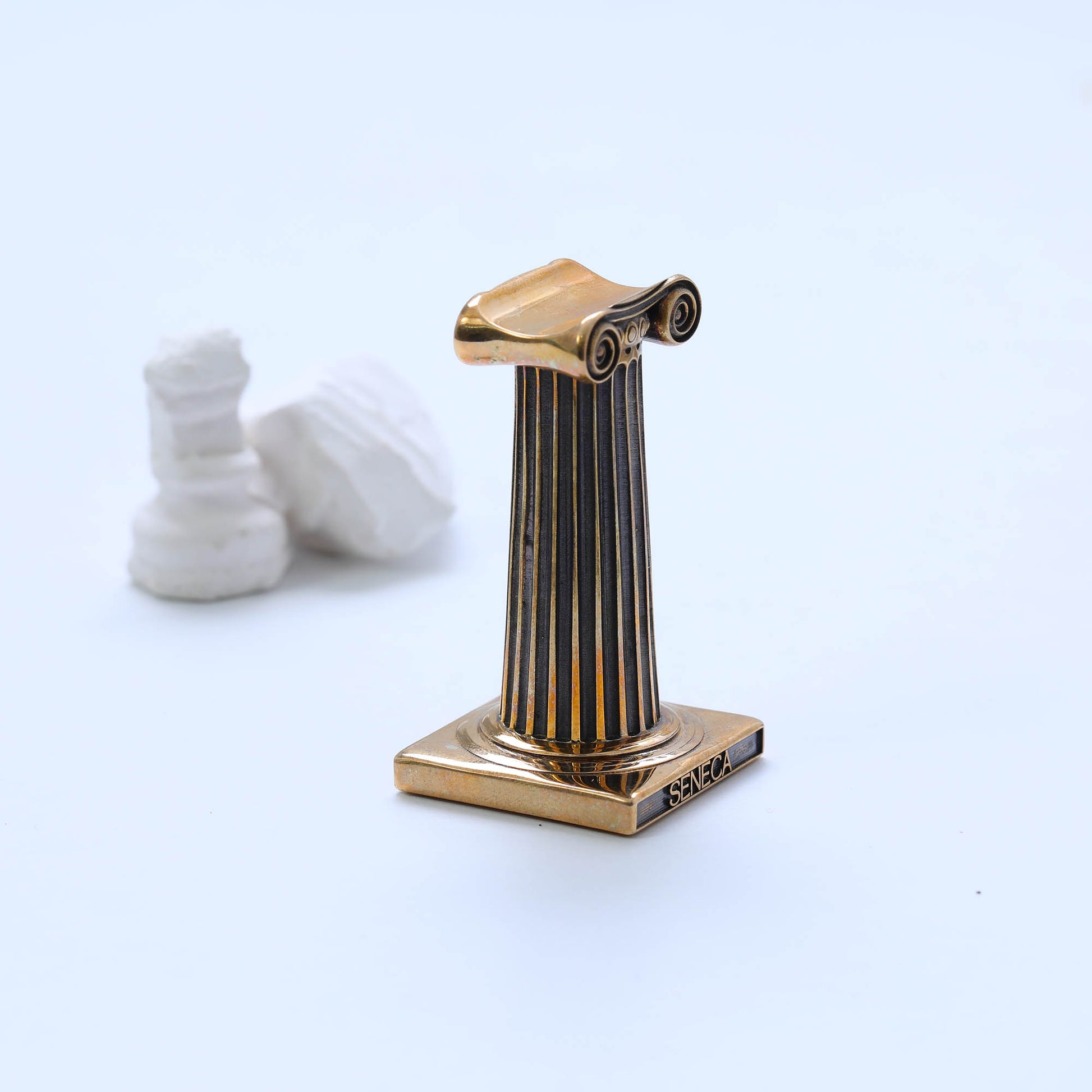 El yapımı olmasının verdiği tok ağırlık, İyonik başlığın (volüt) zarif kıvrımları ve sütun gövdesindeki dikey yivler, ona hem görsel hem de dokunsal bir zenginlik katar. Sağlam kare kaidesi, "SENECA" imzasıyla mühürlenmiştir.